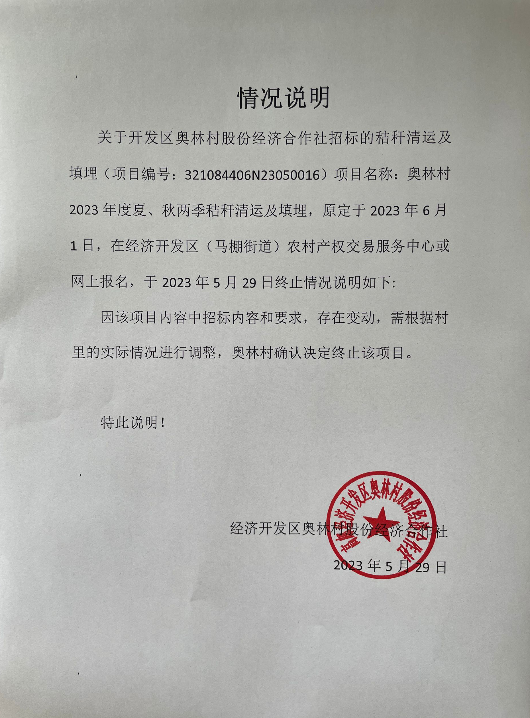 开发区奥林村2023年度夏、秋两季秸秆清运及填埋项目终止情况说明